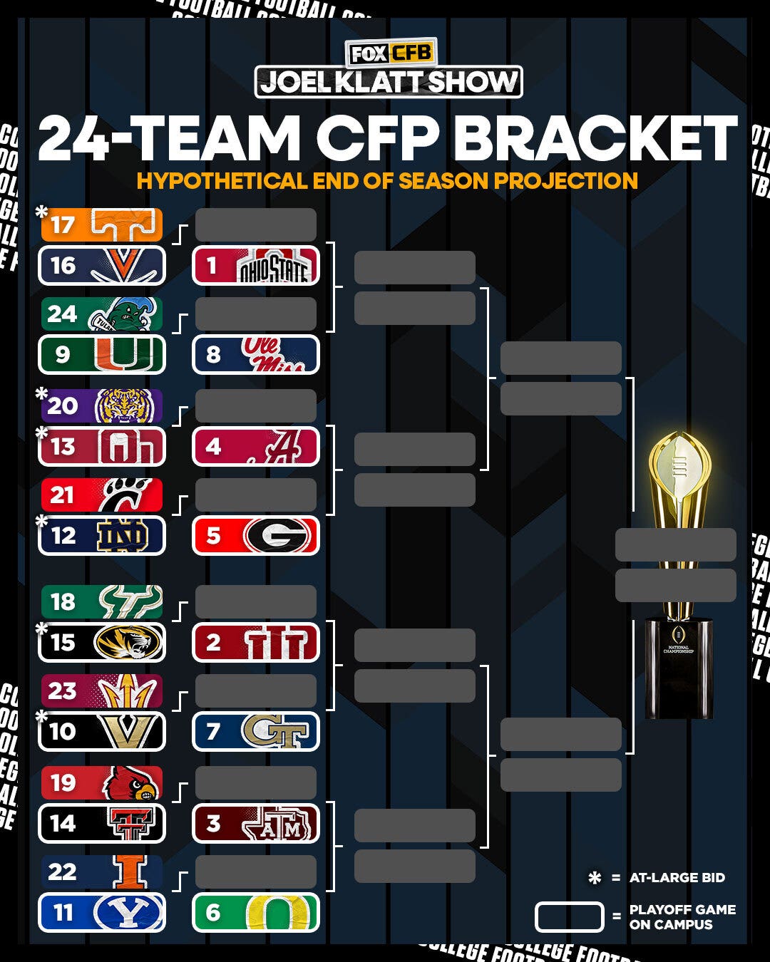 So, now that we know the basics of the 24-team CFP format, what would it actually look like? Well, Klatt took a chance at figuring out how the 24-team field might look by using the most recent AP Poll. While many of those teams’ seeds would be the same as their ranking in the AP Poll, this isn’t as simple as picking the top 24 teams in the poll because of the automatic qualifiers.