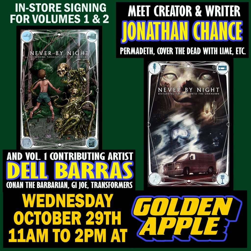 Never By Night Volume 2 released earlier this month and Jonathan Chance will be signing tomorrow at Wednesday, October 29th New Comic Day at the world famous Golden Apple to promote volumes 1 and 2 along with some other horror goodies like Never By Night tees, autographed cards and more tales of terror on the table …oh, and did I mention legendary illustrator and storyboard artist Dell Barras (Conan the Barbarian, Fright Night, Blue Beetle) as the contributing illustrator will be there too?