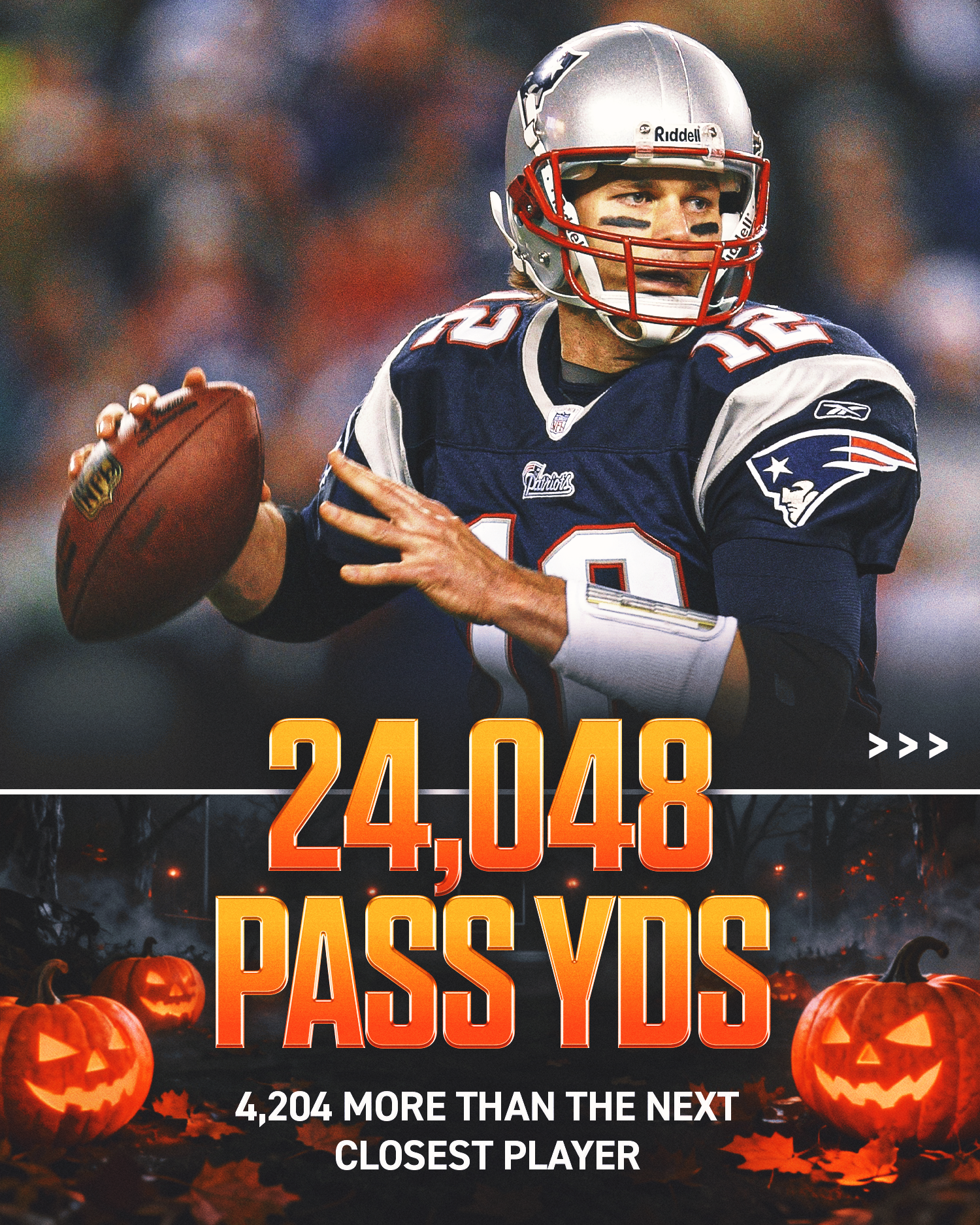 24,048: Brady has the most passing yards (24,048) of any QB all-time in the month of October – 4,204 more yards than the next player.