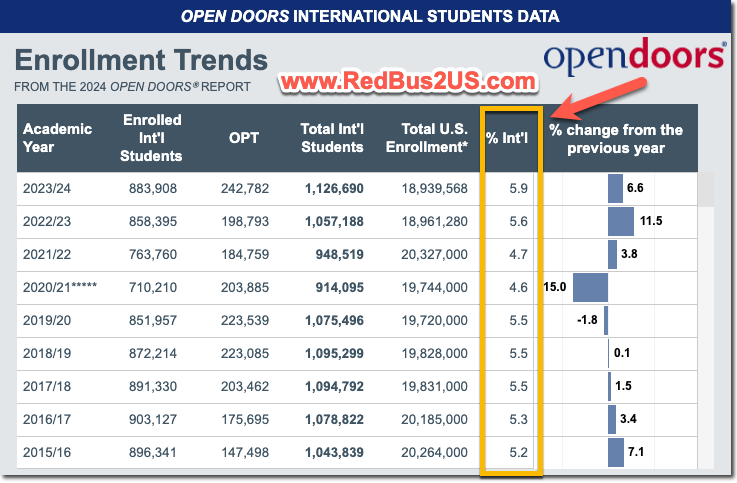According to data provided by OpenDoors on international students in the US, last year, approximately 1.12 million, which equals 5.9 percent of the total US student enrollment, consisted of international students. See the screenshot below related to the same.